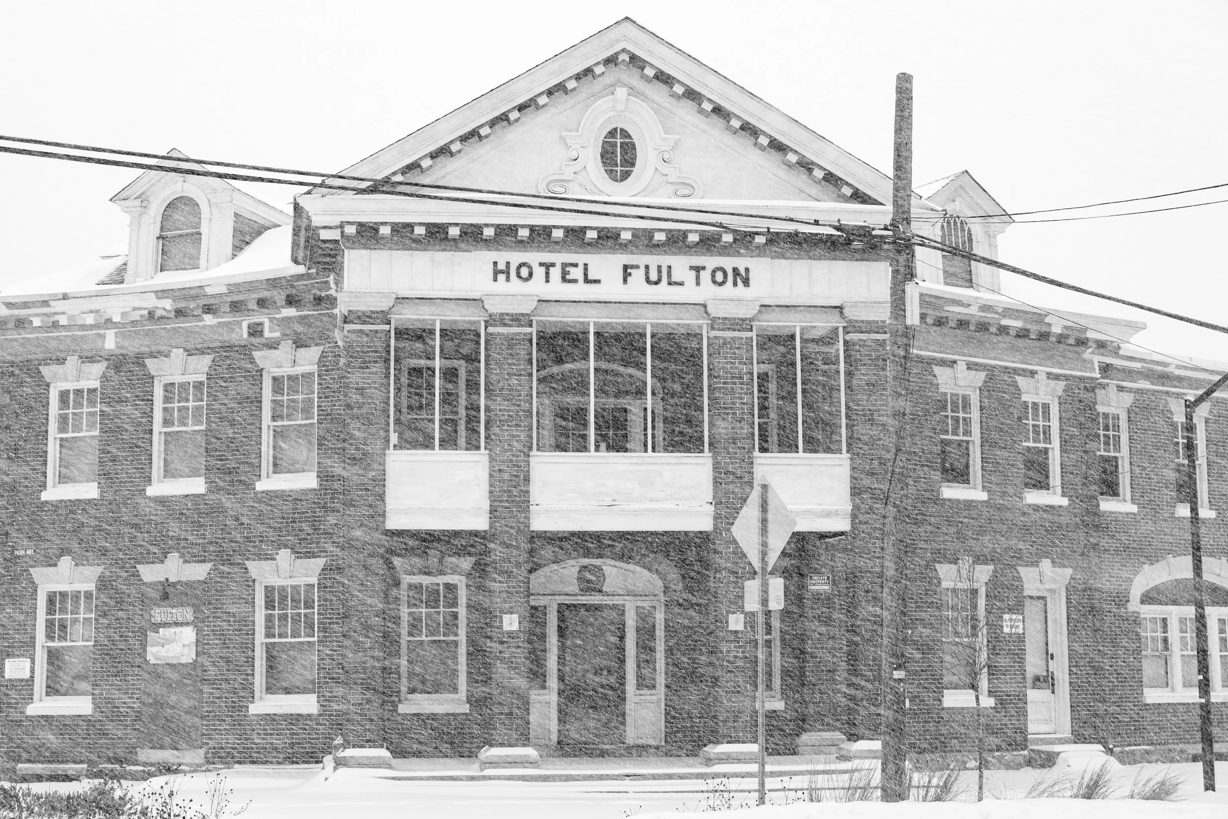 My second photo captured an old building standing stoic against the fierceness of the falling snow. The building, known as Hotel Fulton, has some local history. It was erected in the early 1900s and has served as a hotel, club, bar and most recently a restaurant. For the past few years, it has stood empty – maybe one day it will re-open. But, to me, it’s a beautiful example of early 1900’s architecture, only accentuated by a blizzard.